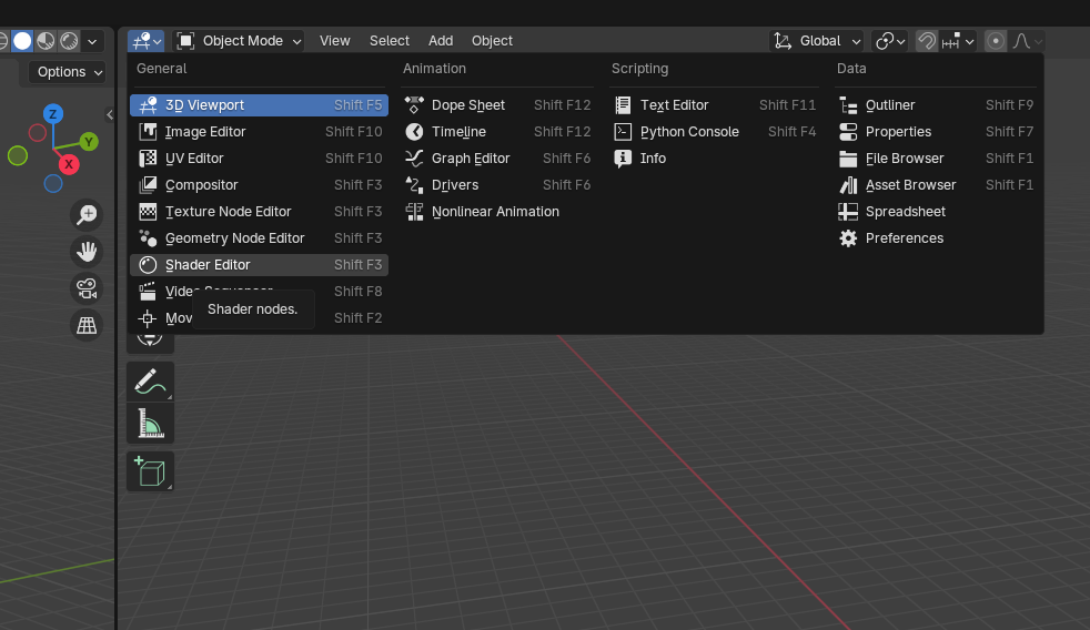 우측 상단의 쉐이더 타입을 월드로 설정하면 스카이 텍스쳐가 노드 형식으로 배경에 적용된 것을 볼 수 있다.