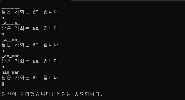 보면 실행시마다 랜덤한 단어가 정답이 되며 글자 수에 맞춰 언더바를 생성하고