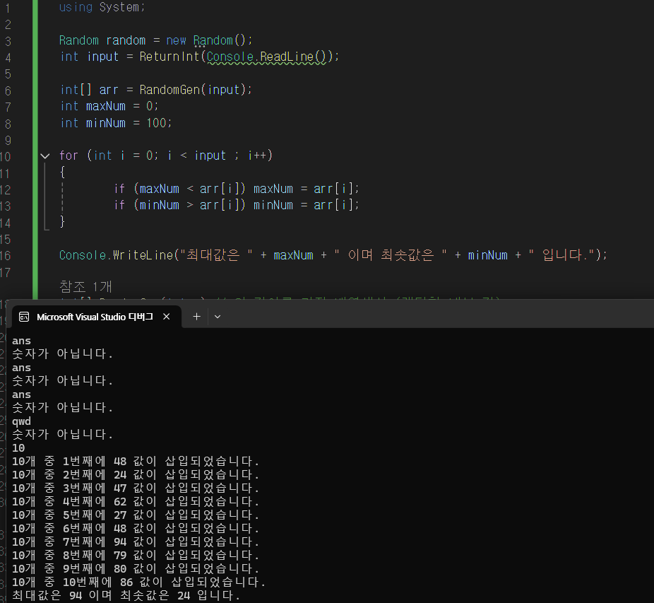 마찬가지로 최대숫자 변수와 최소숫자 변수를 넣고 모든 배열을 for 문을 통해 단순비교하여 크면 최대숫자 작으면 최소숫자에 넣어주자.