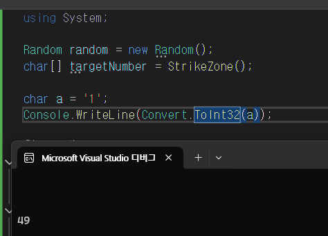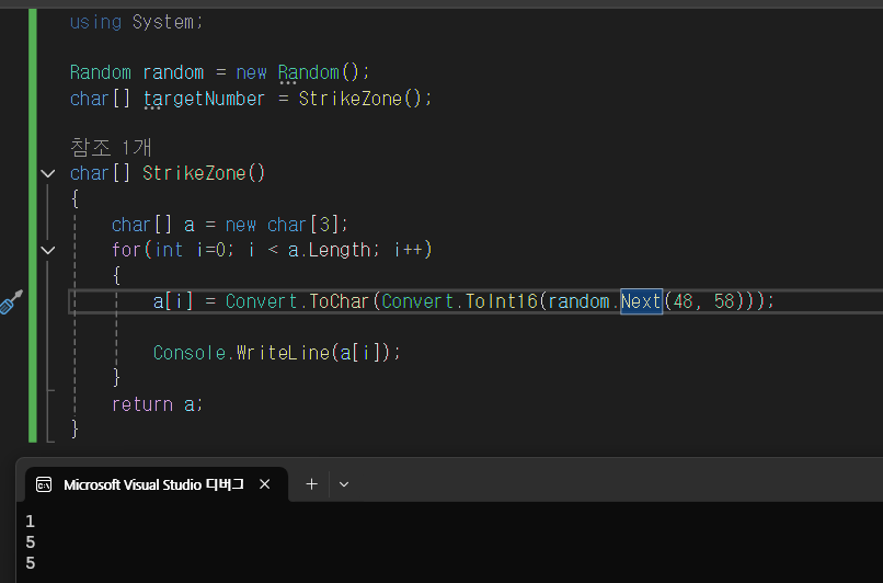 char[] targetNumber = StrikeZone(); //스트라이크존 함수로 랜덤한 3개의 숫자를 생성