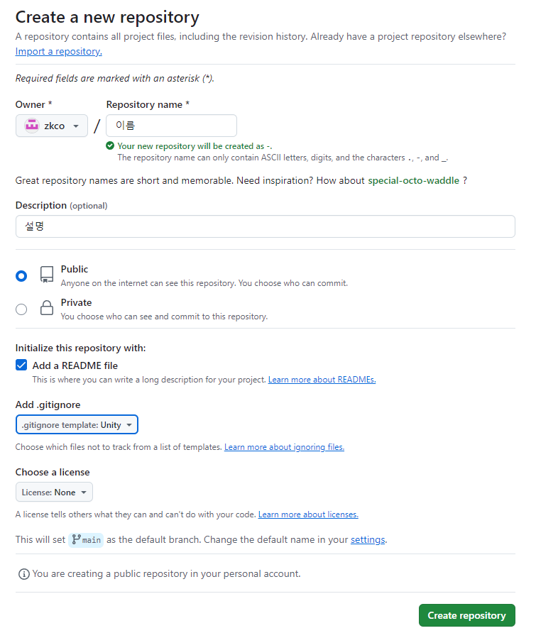 우선 웹사이트에서 new Repository를 통해 새로운 저장소를 작성해보자.