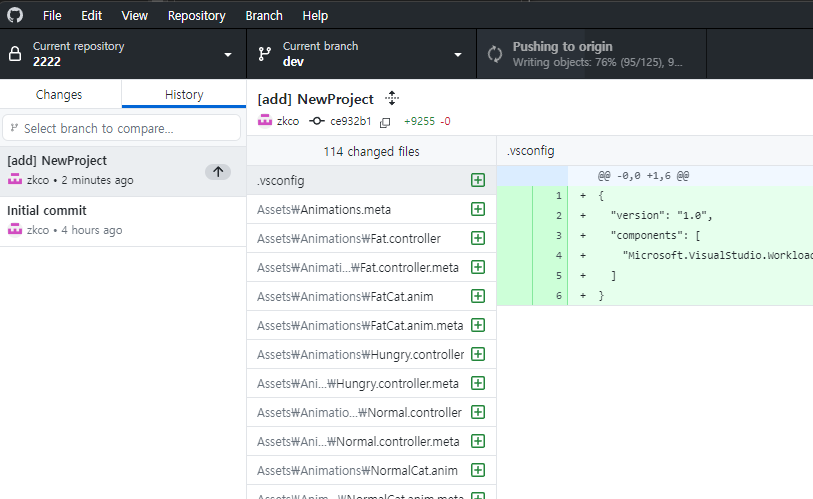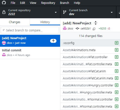 이제 current branch가 dev에 있는지 확인하고 커밋해보자.