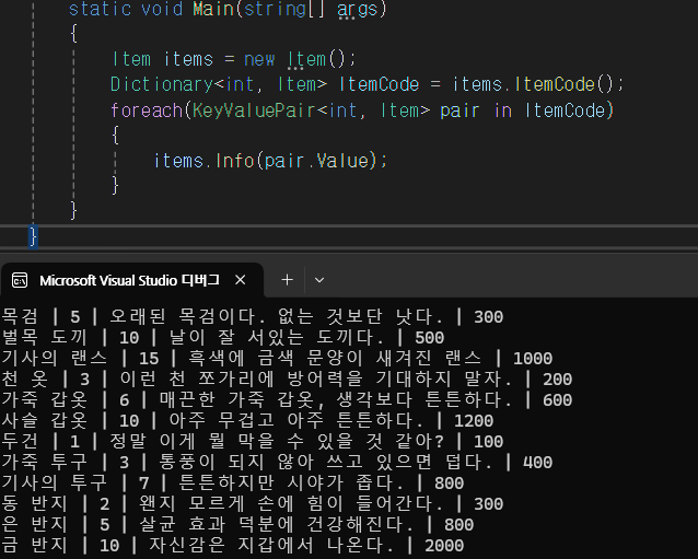ItemCode라는 이름의 Dictionary를 생성해주고 만들어진 item들을 키와 함께 저장해서 바깥으로 돌려주겠다.