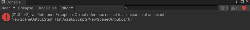 샘플 신에서 게임오브젝트가 뉴 신으로 넘어오면서 파괴되었기에 아무런 값도 가지지 못한다.