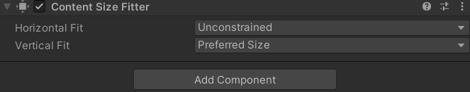 Content Size Fitter 컴포넌트를 추가해주고 위아래로 스크롤 할거기 때문에 Vertical Fit을 Preferred Size로 설정해주자.