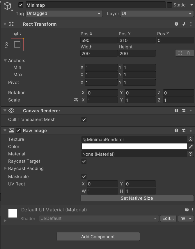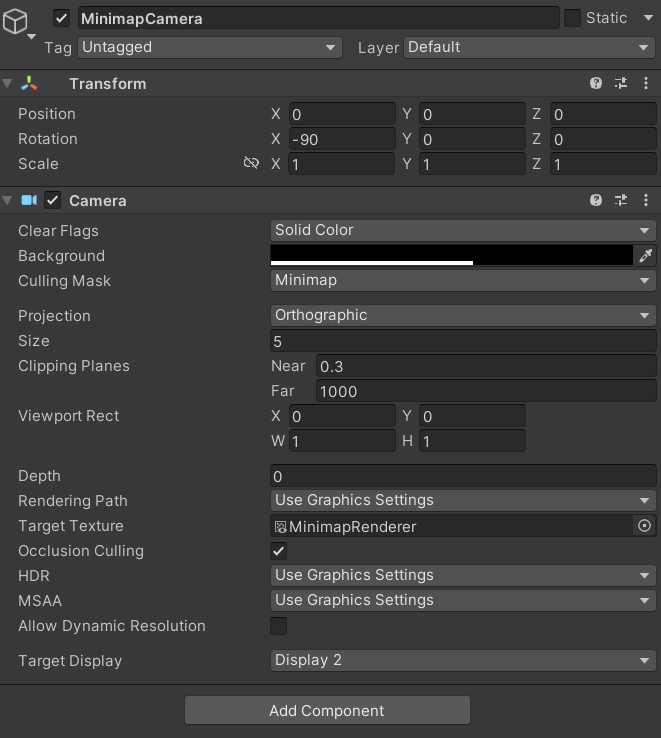 인스펙터 창에 미니맵 카메라를 추가해준다.