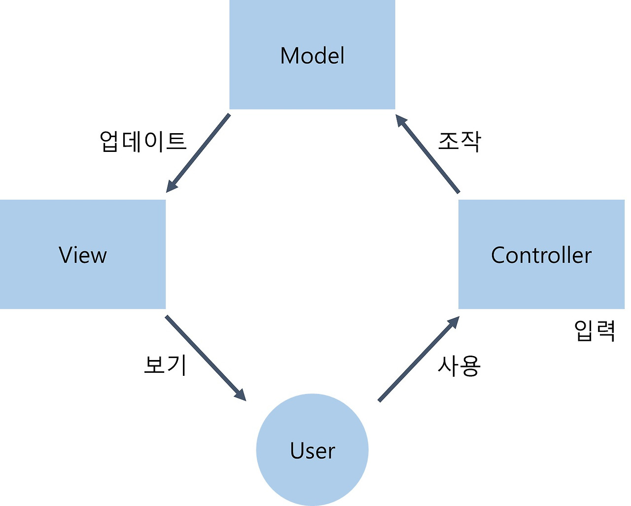 데이터를 담는 Model, 화면에 보여주는 View, 그 둘을 조작하는 Controller로 나눠진 패턴이다.