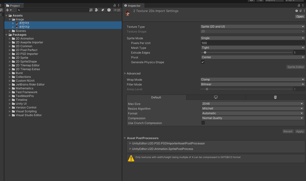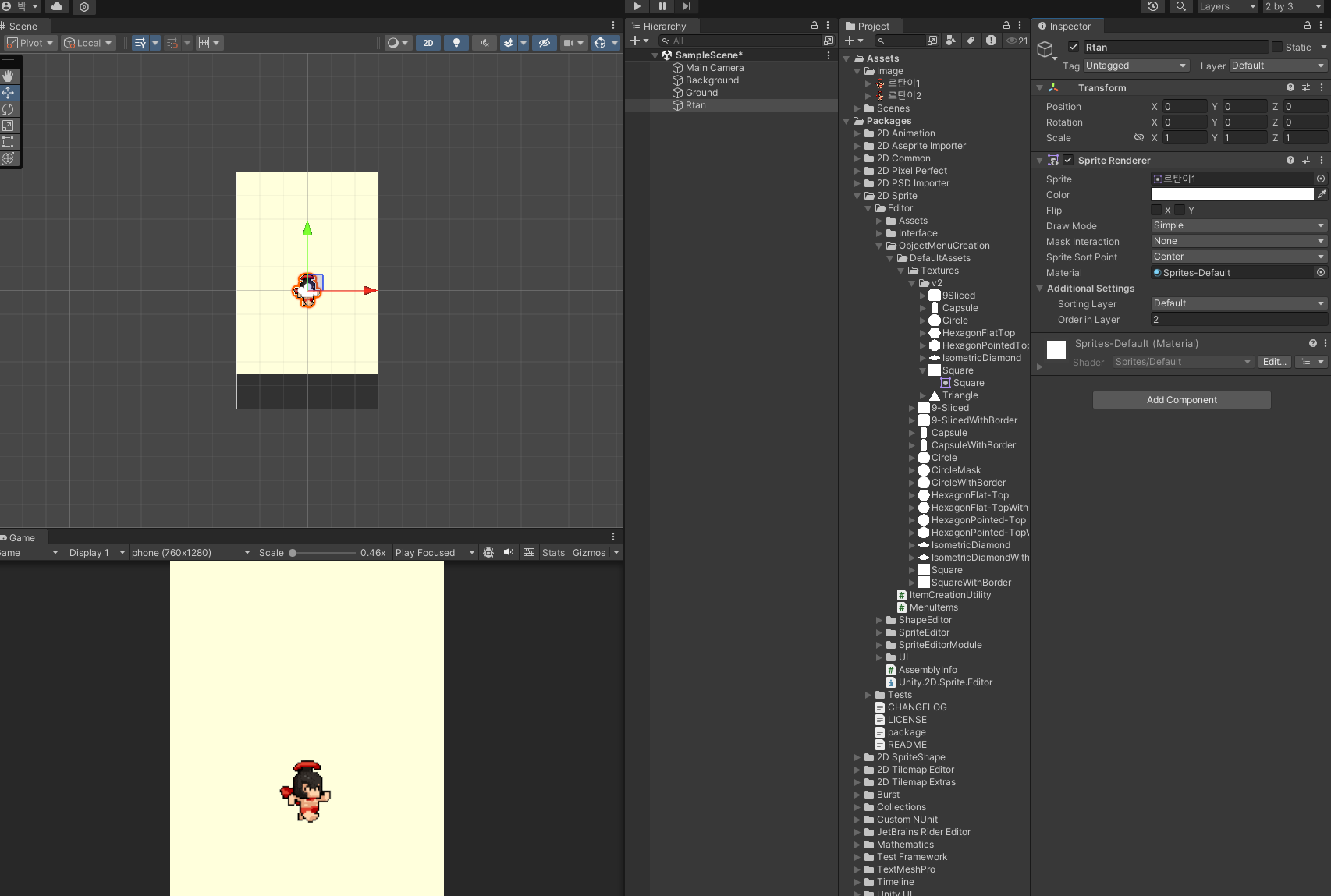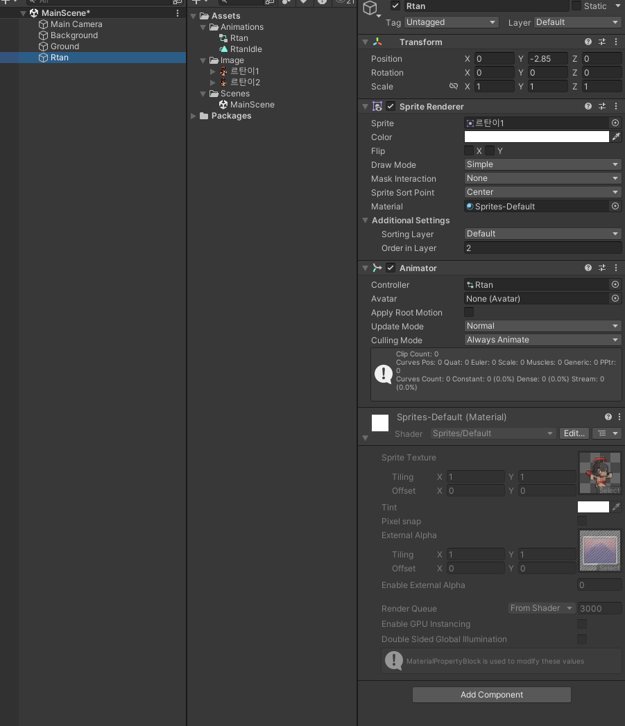 추가한 캐릭터를 스퀘어 Inspector 창에 Sprite 부분에 드래그 앤 드롭 해주고 Order in Layer 부분의 값을 조정해서
