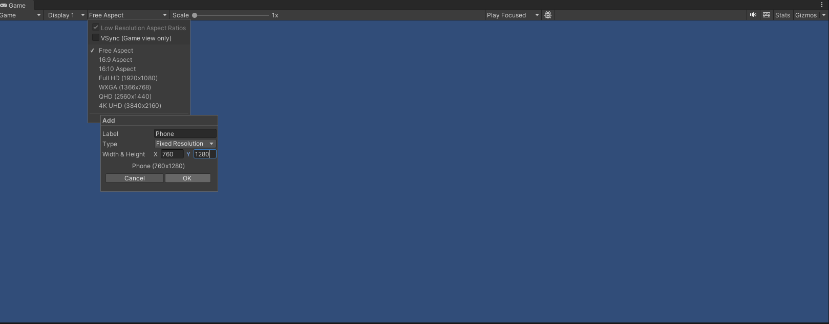 씬 화면 위 Free Aspect를 눌러 화면 해상도를 설정 가능하다. 설정하면
