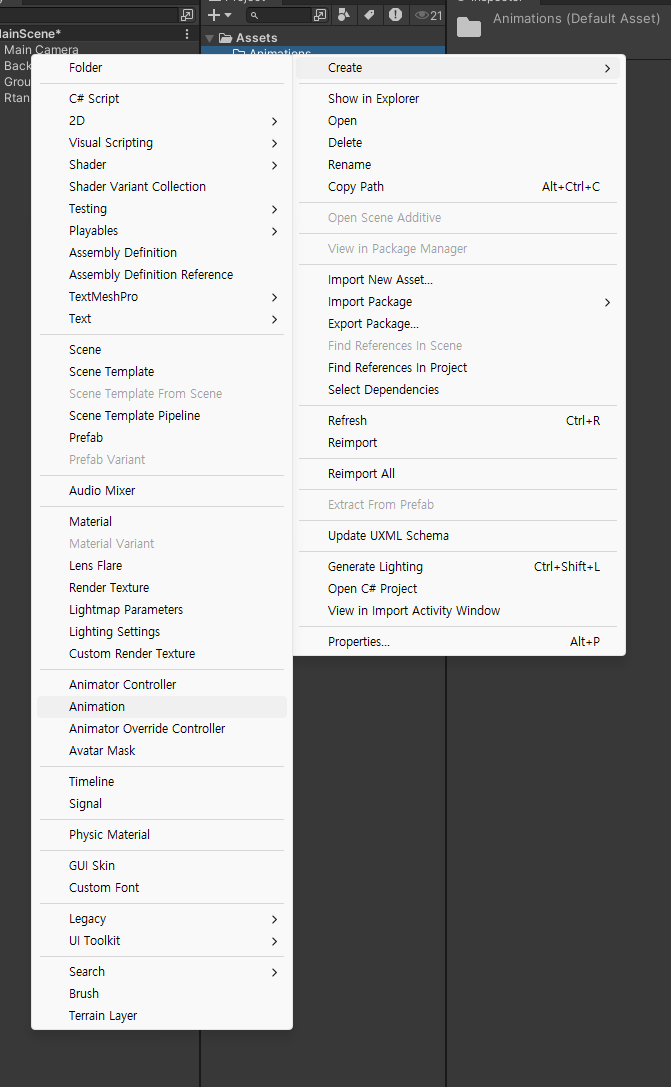 에셋 창에 애니메이션 폴더를 추가해주고 애니메이션을 추가해준다.