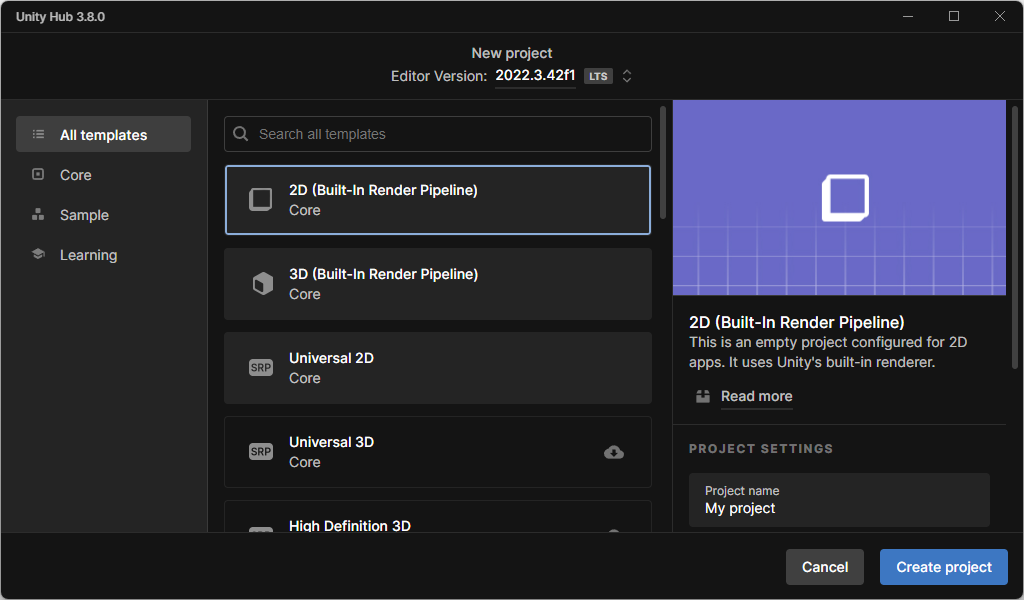 All templates에서 2D 코어선택