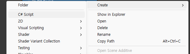 프로젝트 에셋 폴더 안에 Script폴더를 추가하고 폴더 안에 C# 스크립트 파일을 추가해준다.