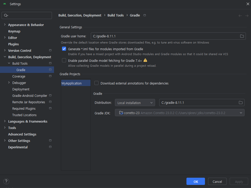 Distribution을 Wrapper에서 Local Installation으로 변경 후 gradle 폴더의 절대위치를 정해 줌