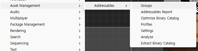 그러면 이제 Winow창에 Addressables가 생성되는걸 확인 할 수 있다.