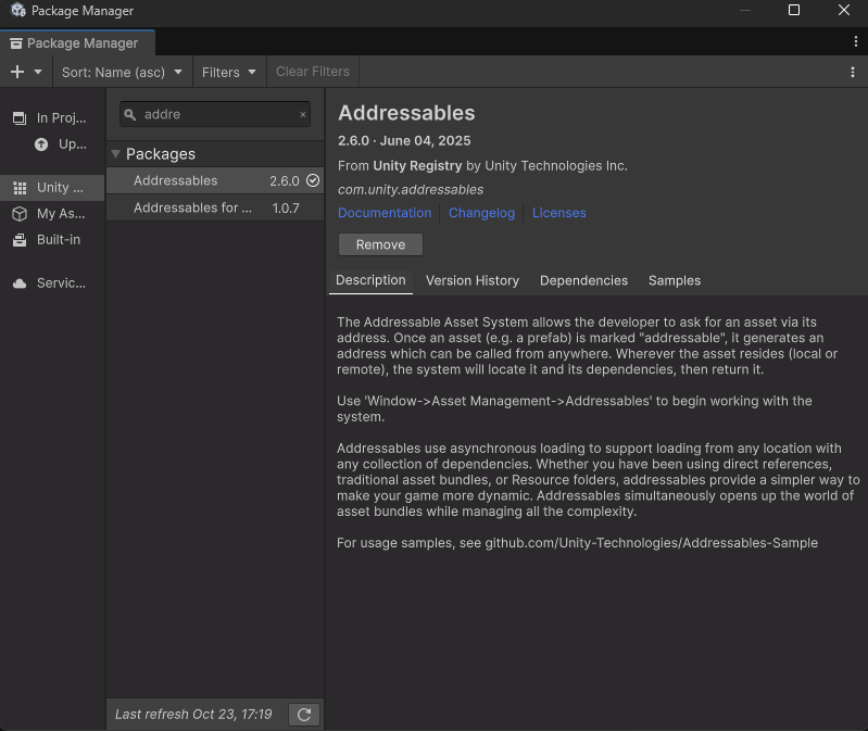 우선 패키지 매니저에서 어드레서블을 다운로드 한다.