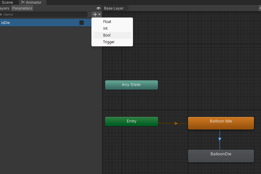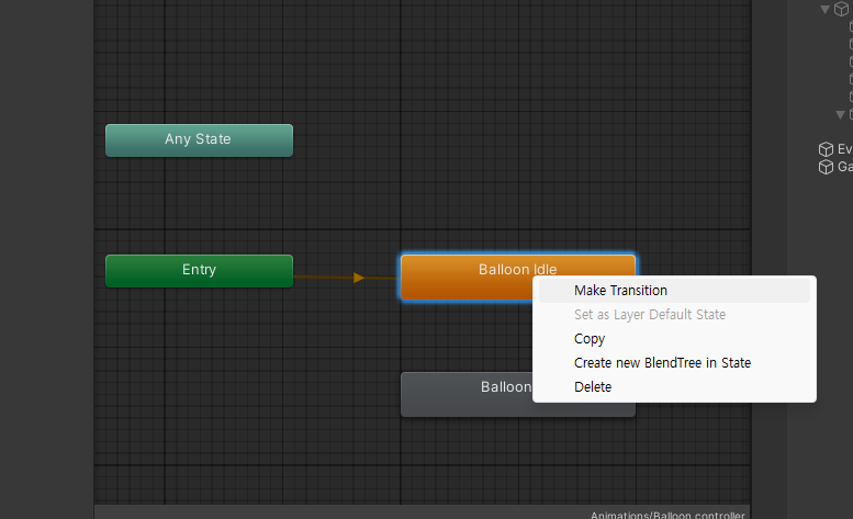 make Transition을 눌러 BalloonDie로 연결해준다.