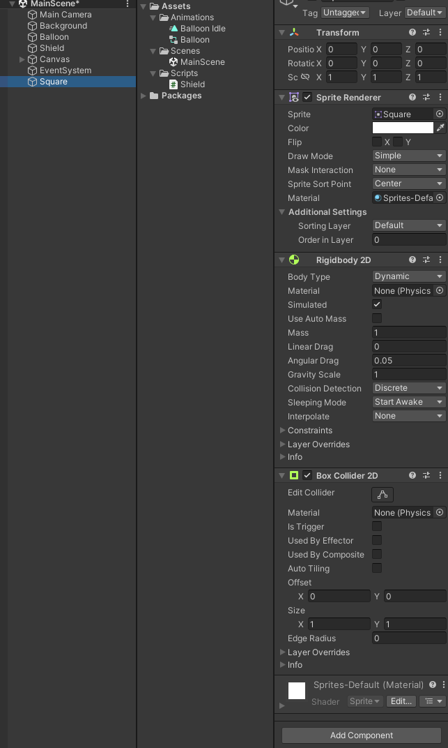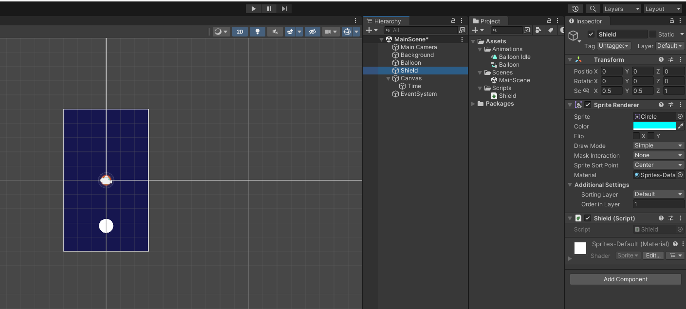 마찬가지로 실드와 풍선에도 Circle Collider 2D를 추가하는 걸 잊지 말자.