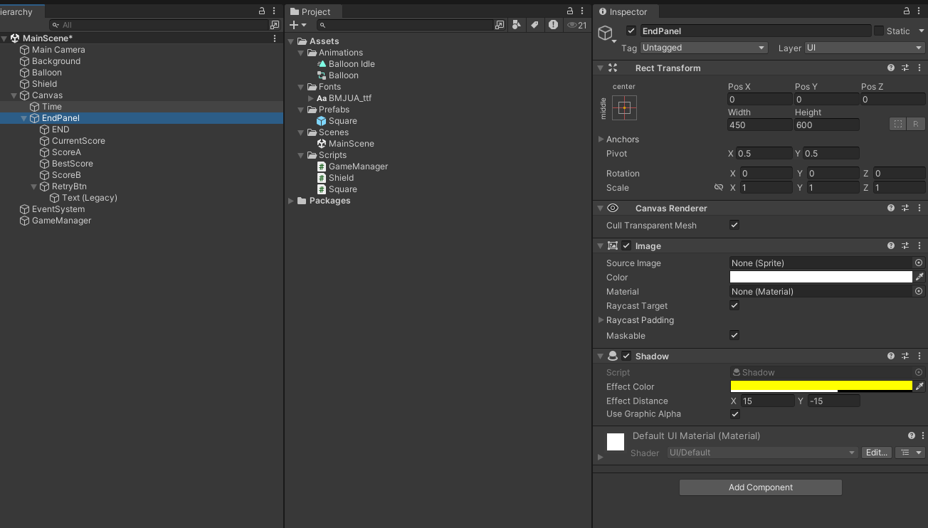 우선 게임 종료를 위해 EndPanel UI를 만들어주자