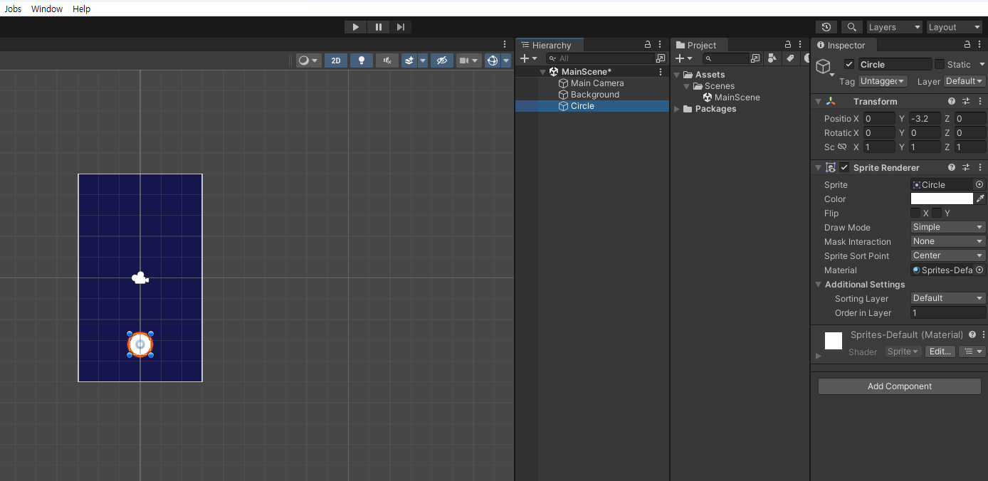 이제 메인이 될 풍선을 만들어준다. 2D Sprite 중에 Cicle을 선택하고 위치를 조정해주자.