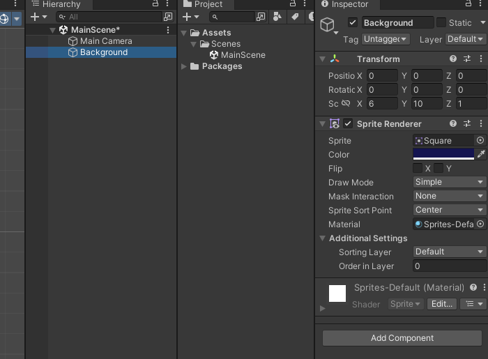 스퀘어 스프라이트를 만들고 색상과 크기를 조절하고 백그라운로 이름을 변경한다.