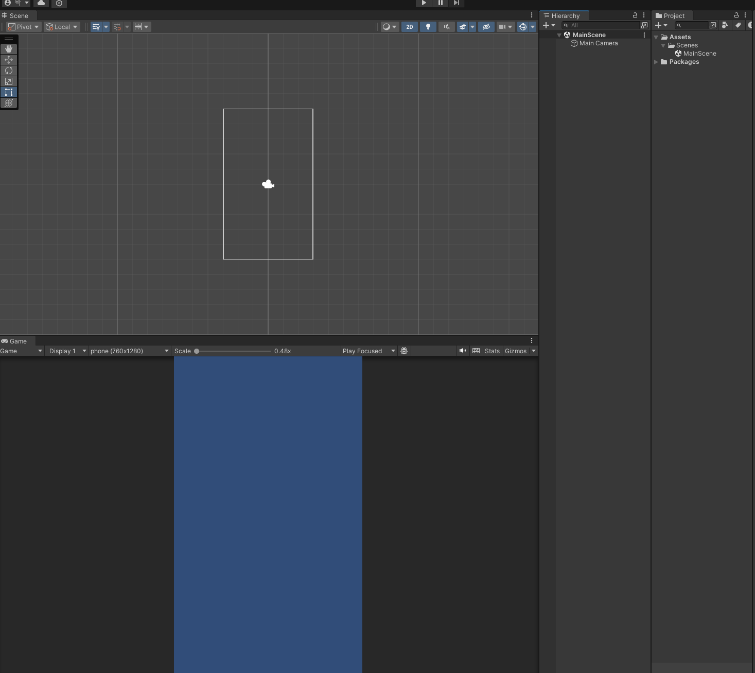 기본세팅은 잊지말고 2by3 레이아웃과 해상도 조절, 씬 이름을 메인 씬으로 변경해준다.