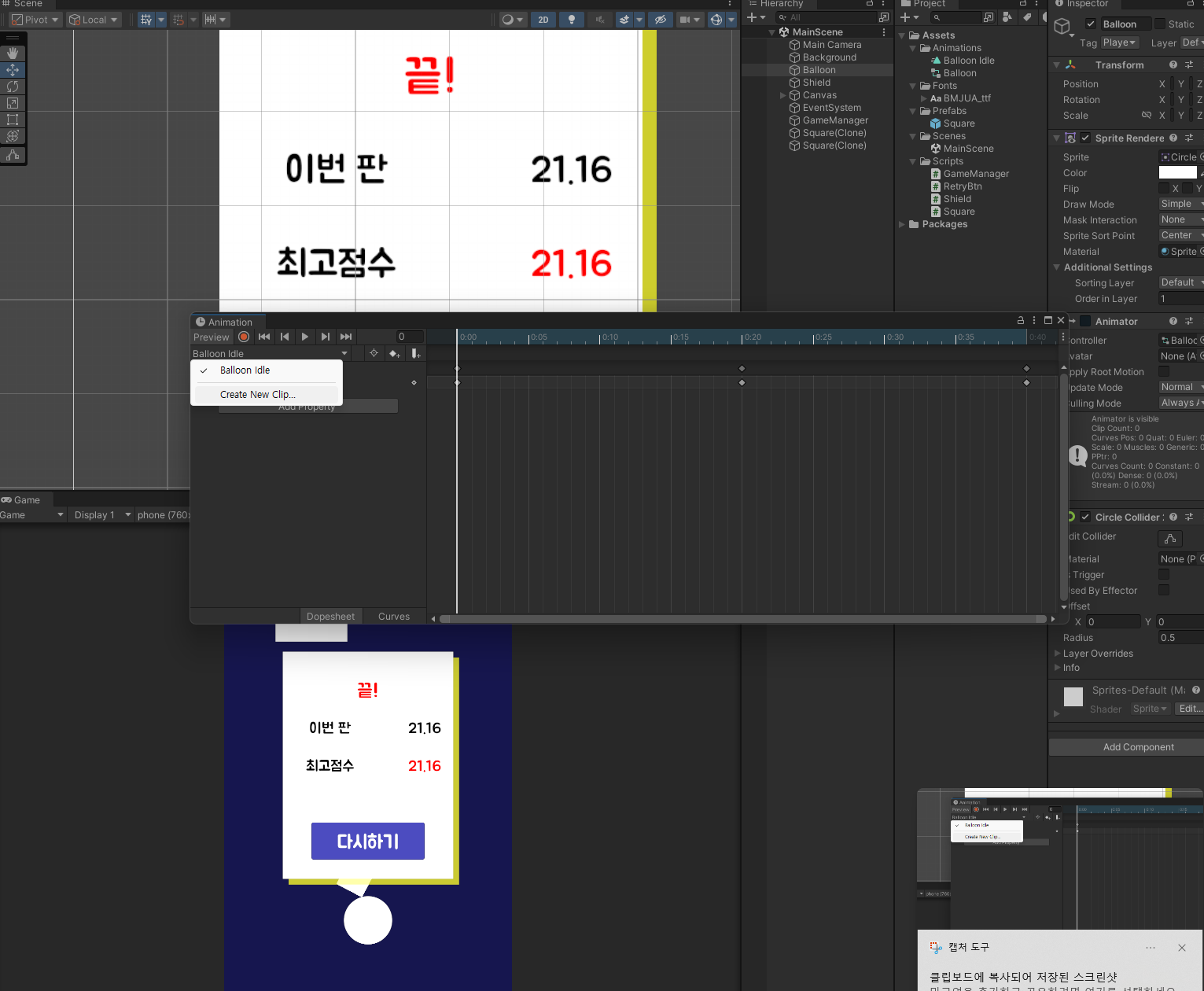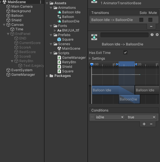 애니메이터 Anim 변수를 선언해서 Balloon 애니메이터를 참조할 수 있게 한 후 게임오버 함수에 아까 만든 애니메이션 조건문을 True로 설정하게 한 다음 시간을 멈추는 부분을 TimeStop함수로 빼내서 Invoke로 애니메이션이 재생될 시간을 벌어주었다.